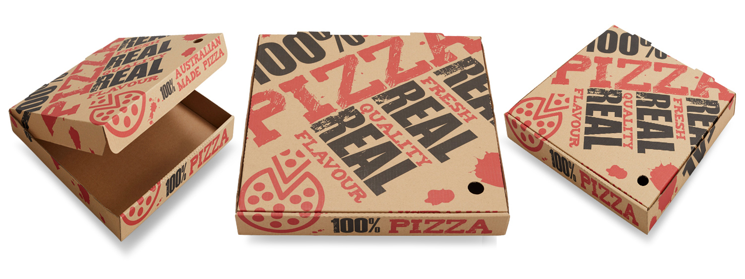 '100% Pizza' is one of First Pack Group's more contemporary pizza box designs and is available mainly in the Western Australian market - unless specially requested. It's produced in brown recycled Kraft E-flute board, this single fold pizza box ticks all the boxes for quality, design and price.