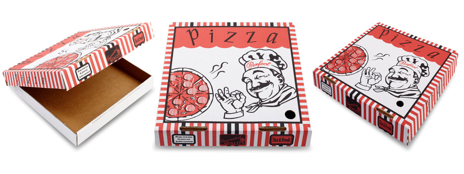 First Pack Group's Perfect Pizza White design print is one of the most recognisable double fold pizza boxes in the pizza market today. Available in strong white Kraft B-flute board, this box is ideal for that heavily topped pizza that needs to be home delivered safely.